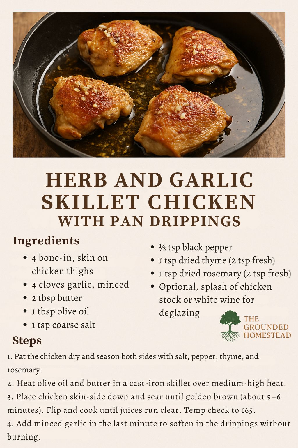 This herb and garlic skillet chicken checks every box—crispy skin, tender meat, and pan drippings rich enough to pour right over roasted vegetables or mashed potatoes. It’s homestead cooking at its best: a few fresh herbs, a little butter, and a hot cast-iron skillet.