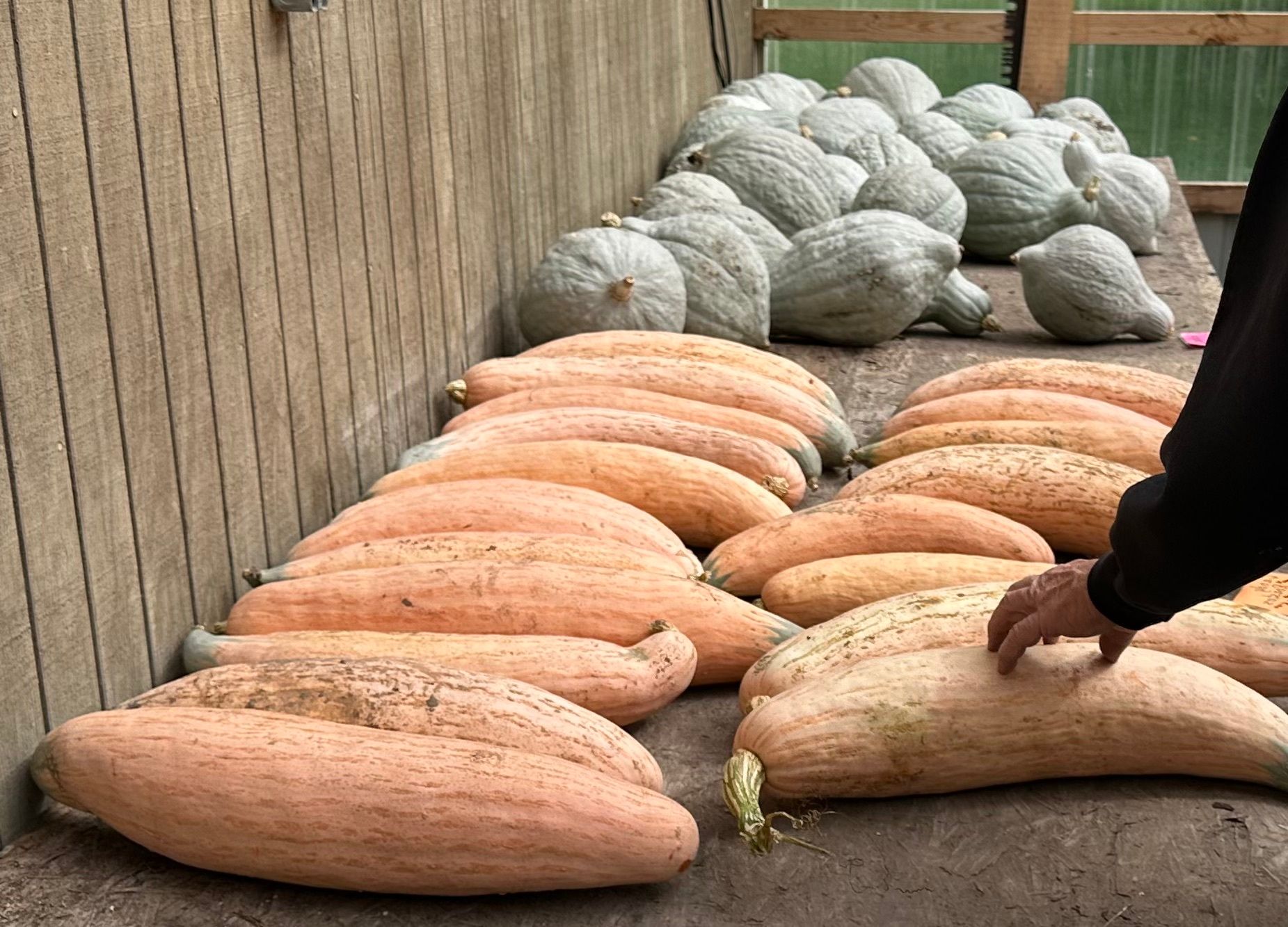 Hubbard squash and North Georgia candy roaster squash curing in the greenhouse