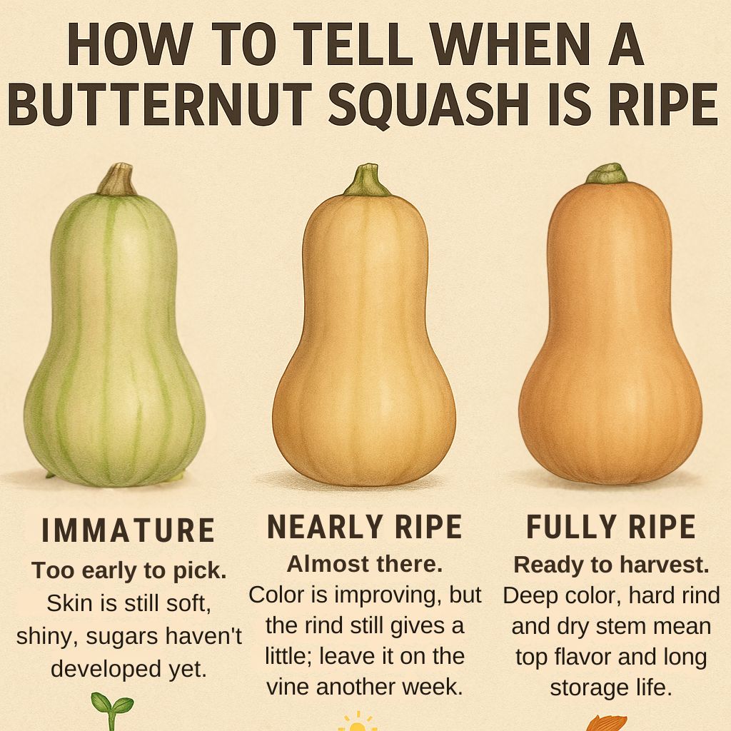 Reading the Signs: When Butternut Squash Is Ready to Pick![]() color changes as a butternut squash ripens When you’ve grown squash long enough, you stop relying on the calendar and start reading the plants. Butternut squash tells you when it’s ready: the rind deepens to a warm, matte tan, the skin grows firm, and the stem turns dry and woody. The surest test is with your fingernail: when you press against the rind and it won’t pierce or scratch easily, that squash has hardened enough to store. Over the years, I’ve learned to trust those signs more than any date on the seed packet. Pick too soon, and the flavor stays flat; wait too long, and moisture can have the fruit rot on the vine. | ![]() These three signs—color, rind hardness, and stem dryness—are the universal language of ripeness. If you’re unsure, this week’s full post walks through how to spot ripeness across the most common types—Butternut, Acorn, and Spaghetti—so your harvest holds strong and your storage squash stays sweet through winter. See the full breakdown here. |