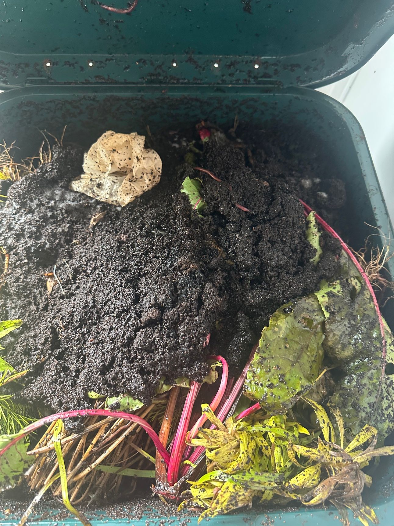 worms going to town in out compost bin