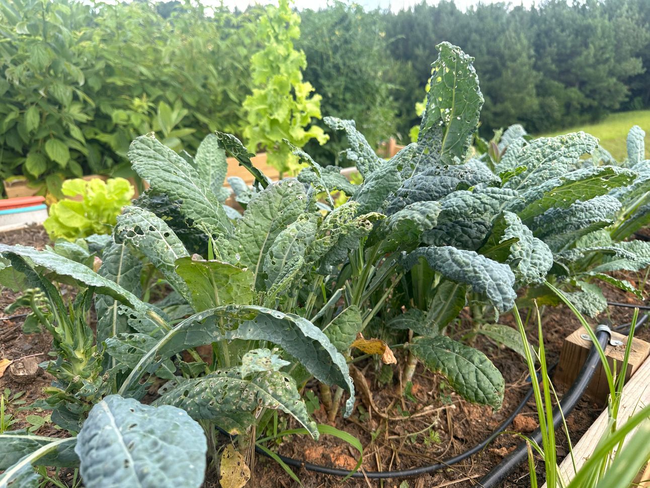 The kale beds have been producing steady, but each picking comes with a side job—finding the cabbage worms that would love nothing more than to turn the whole patch into lace.